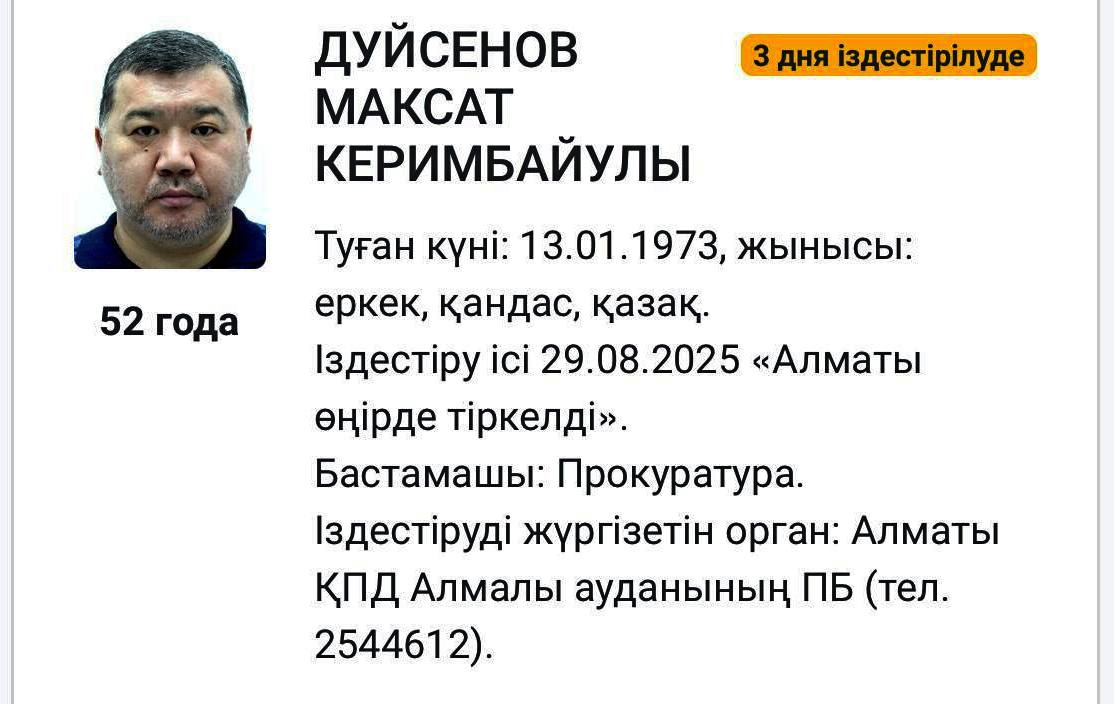 Дуйсенова объявили в розыск в конце августа. Инициировали розыск его же коллеги ― прокуроры. Информацию подтвердили в центральном аппарате. В ведомстве пока не уточнили, в чём подозревают бывшего главного транспортного прокурора республики.