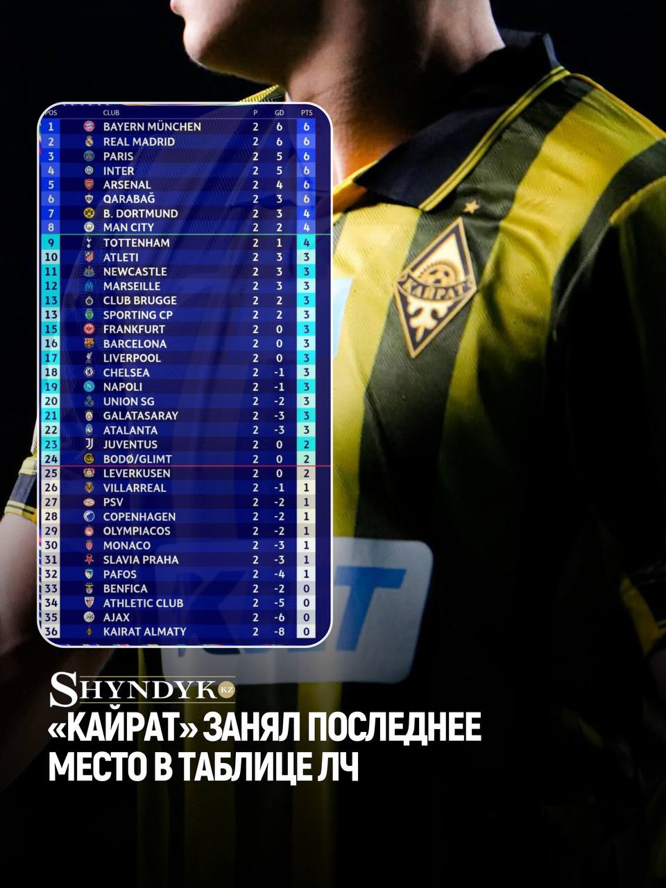 Алматинский «Кайрат» оказался на последнем, 36-м месте в турнирной таблице Лиги чемпионов. Команда Рафаэля Уразбахтина проиграла оба стартовых матча: в первом туре — 1:4 португальскому «Спортингу», во втором крупно уступила мадридскому «Реалу», передаёт SHYNDYK.KZ.