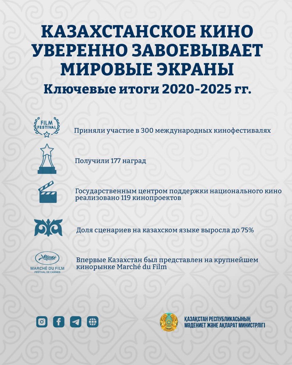 Кинокартины Казахстана приняли участие более чем в 300 международных кинофестивалях и завоевали 177 наград, укрепив позицию страны в мировой киноиндустрии. С 2020 по 2025 годы Государственный центр поддержки национального кино реализовал 119 кинопроектов, охватывающих широкий спектр жанров — от полнометражных художественных фильмов до анимации, передаёт SHYNDYK.KZ.