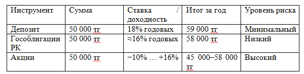В рамках приведенного выше учебного сравнения (одинаковая сумма 50 000 тенге и заданные ставки) депозит с 18% выглядит наиболее прибыльным среди «консервативных» инструментов, потому что он выше примерной доходности гособлигаций 16% и даёт гарантированный результат. Однако это не означает, что депозит всегда является «самым выгодным» инструментом вообще.