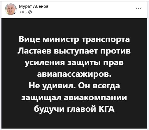 “Вице-министр транспорта Ластаев выступает против усиления защиты прав авиапассажиров. Не удивил. Он всегда защищал авиакомпании будучи главой КГА”, ― заявил мажилисмен.