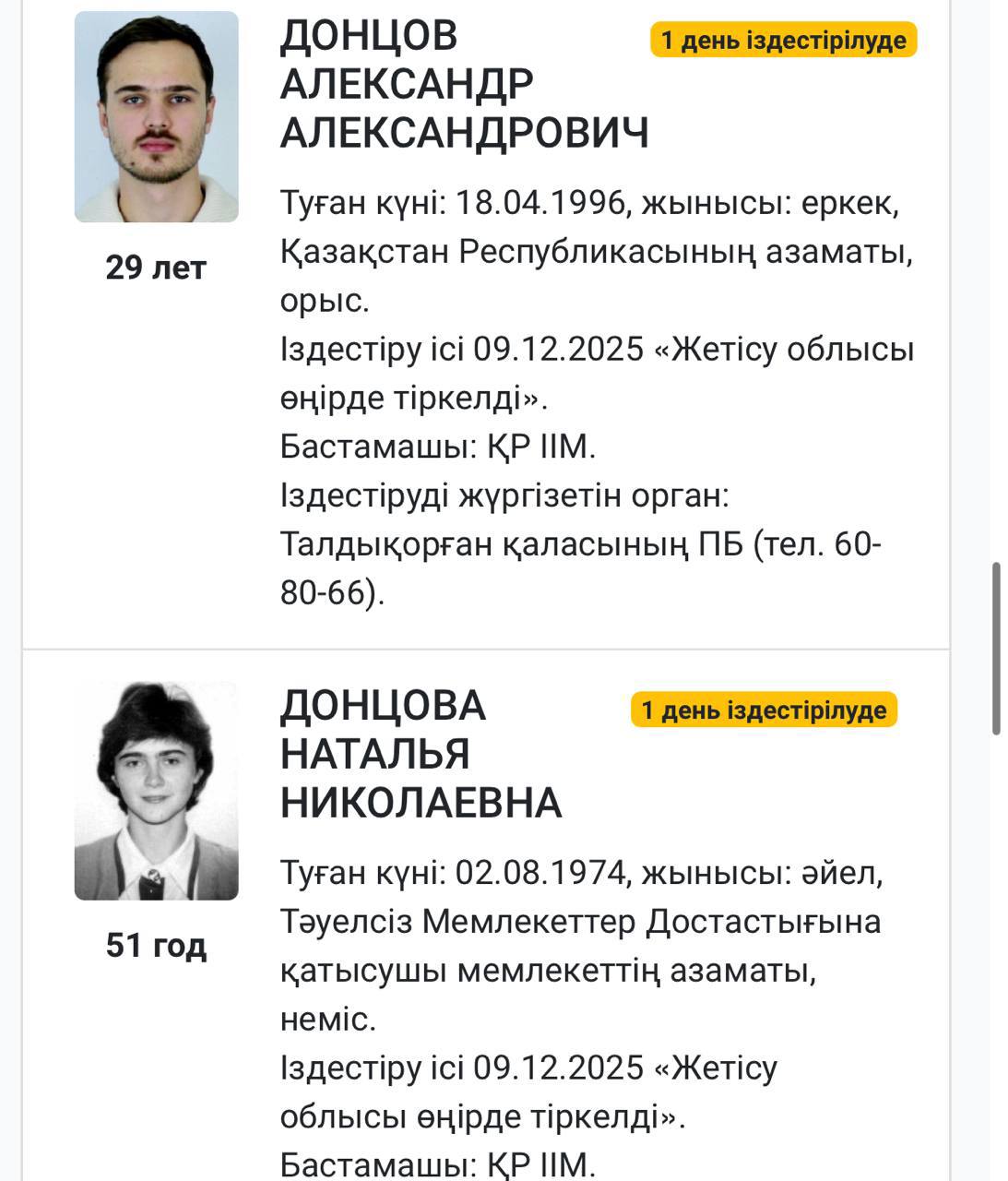 МВД Казахстана объявило в розыск Александра Донцова и его мать Наталью Донцову — супруга и свекровь экс-судьи из Казахстана Айгуль Сайлыбаевой, которую нашли убитой в Германии. Розыск зарегистрирован в Талдыкоргане, сообщает SHYNDYK.KZ.