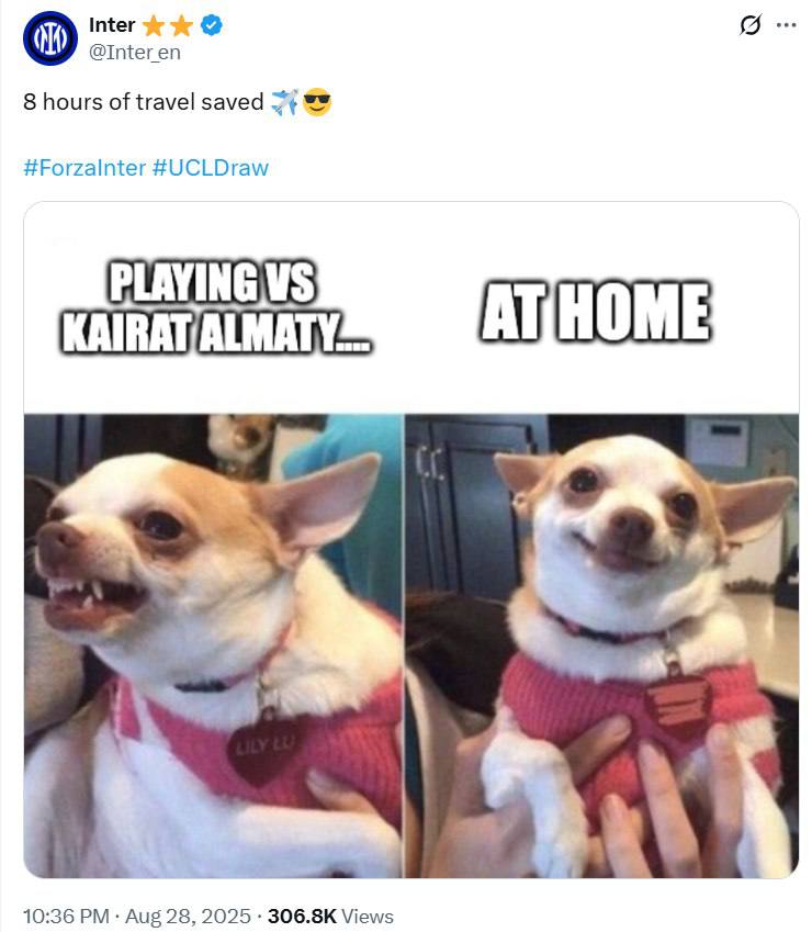 Итальянский «Интер» подошёл к вопросу с юмором. В соцсети X клуб опубликовал мем с собакой, которая сначала выглядит опечаленной от перспективы лететь в Алматы, но быстро радуется, узнав, что матч — домашний.