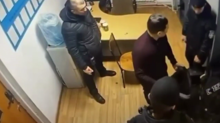 На записи двух сотрудников подразделения оскорбляют с использованием грубой нецензурной брани. Одного из них бьют: сначала рукой по лицу, затем предметом. В это время другой человек держит дверь, чтобы никто не смог зайти внутрь.
