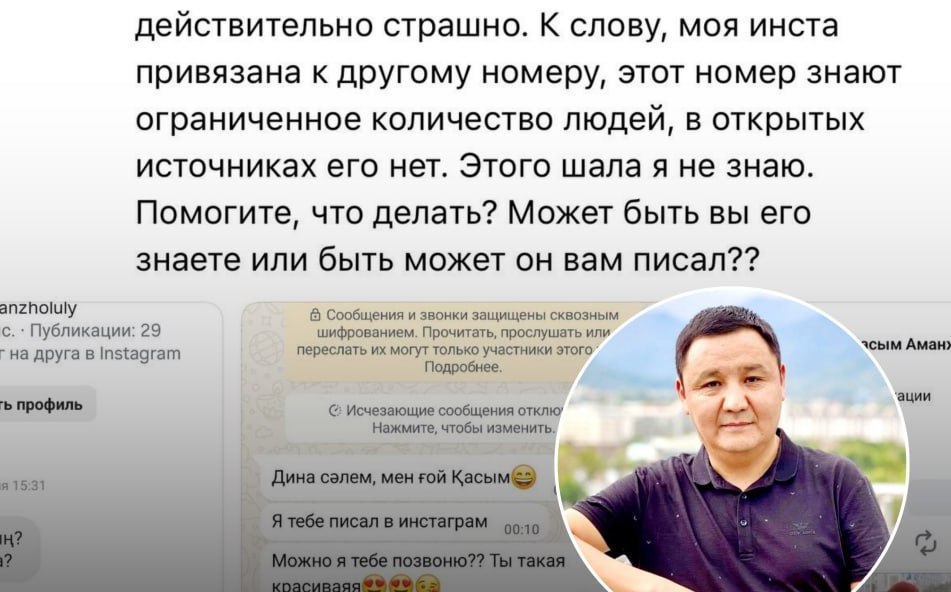 Девушка утверждает, что журналист постоянно писал ей в соцсетях и звал на встречи, позволяя себе обращения вроде «жаным». Сначала сообщения приходили только в мессенджерах, однако позже, как заявила автор поста, Аманжол нашёл её номер телефона и начал звонить, хотя знать его могли лишь немногие. Где именно мужчина мог узнать номер — остаётся загадкой.