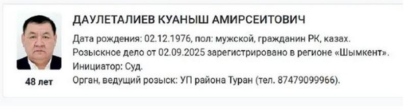 Шымкентская полиция разыскивает бывшего депутата городского маслихата Куаныша Даулеталиева. Розыскное дело в отношении бизнесмена было открыто 2-го сентября, сообщает SHYNDYK.KZ.