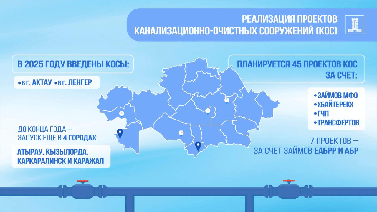 В 2025 году уже введены в эксплуатацию КОС в Актау и Ленгере. До конца текущего года планируется запуск ещё четырёх объектов – в Атырау, Кызылорде, Каркаралинске и Каражале, пообещал Кажкенов.
