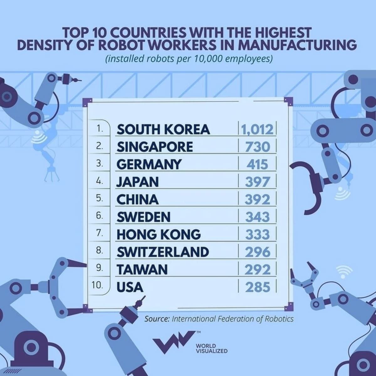 Первое место заняла Южная Корея, на 10 тыс. человек приходится 1 012 роботов. Основу такого результата создают мощные электроника и автомобилестроение, где автоматизация стала неотъемлемой частью производственных процессов.