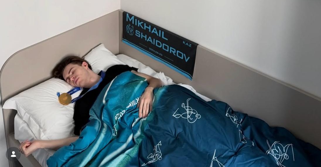 На снимке чемпион запечатлён в кровати, не снимая свою золотую медаль Олимпиады, а на стене за ним висит флаг Казахстана. Кадр быстро разлетелся по соцсетям и стал символом исполнения его спортивной мечты.